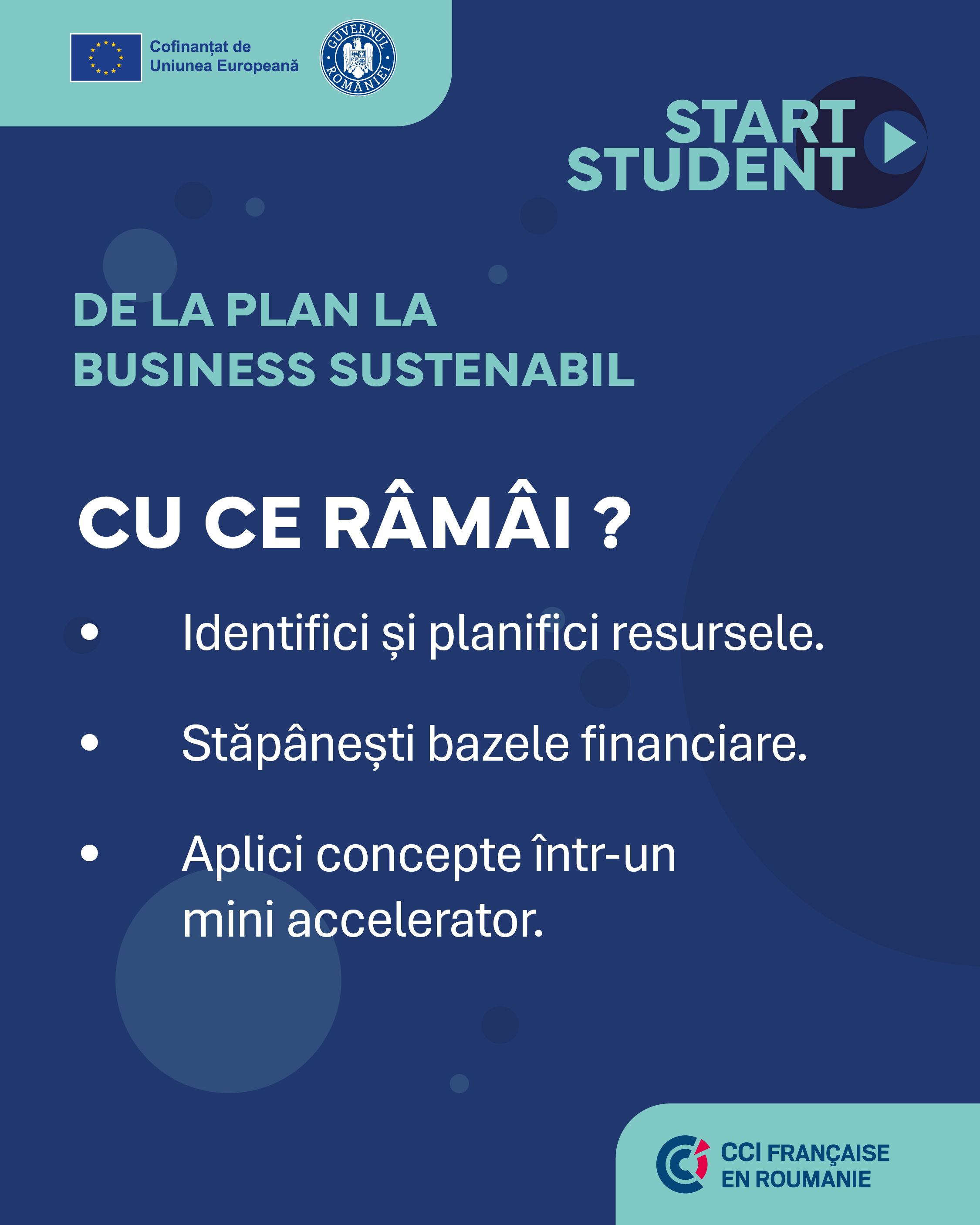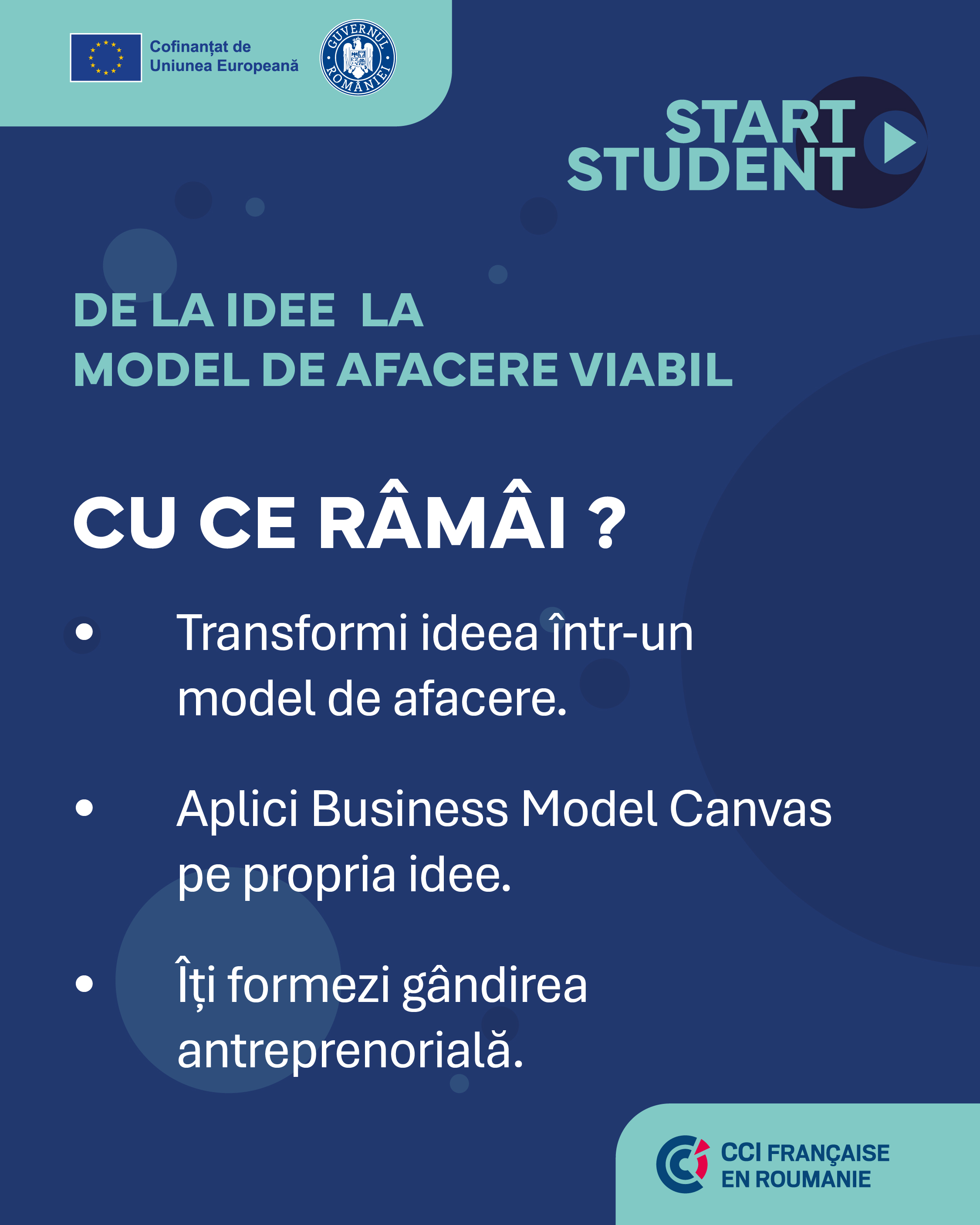 Totul culminează cu formarea practică în business: de la idee la model de afacere și până la resurse și finanțe, pentru ca studenții să aibă nu doar cunoștințe, ci și instrumentele necesare pentru a-și transforma viziunea într-un proiect viabil.