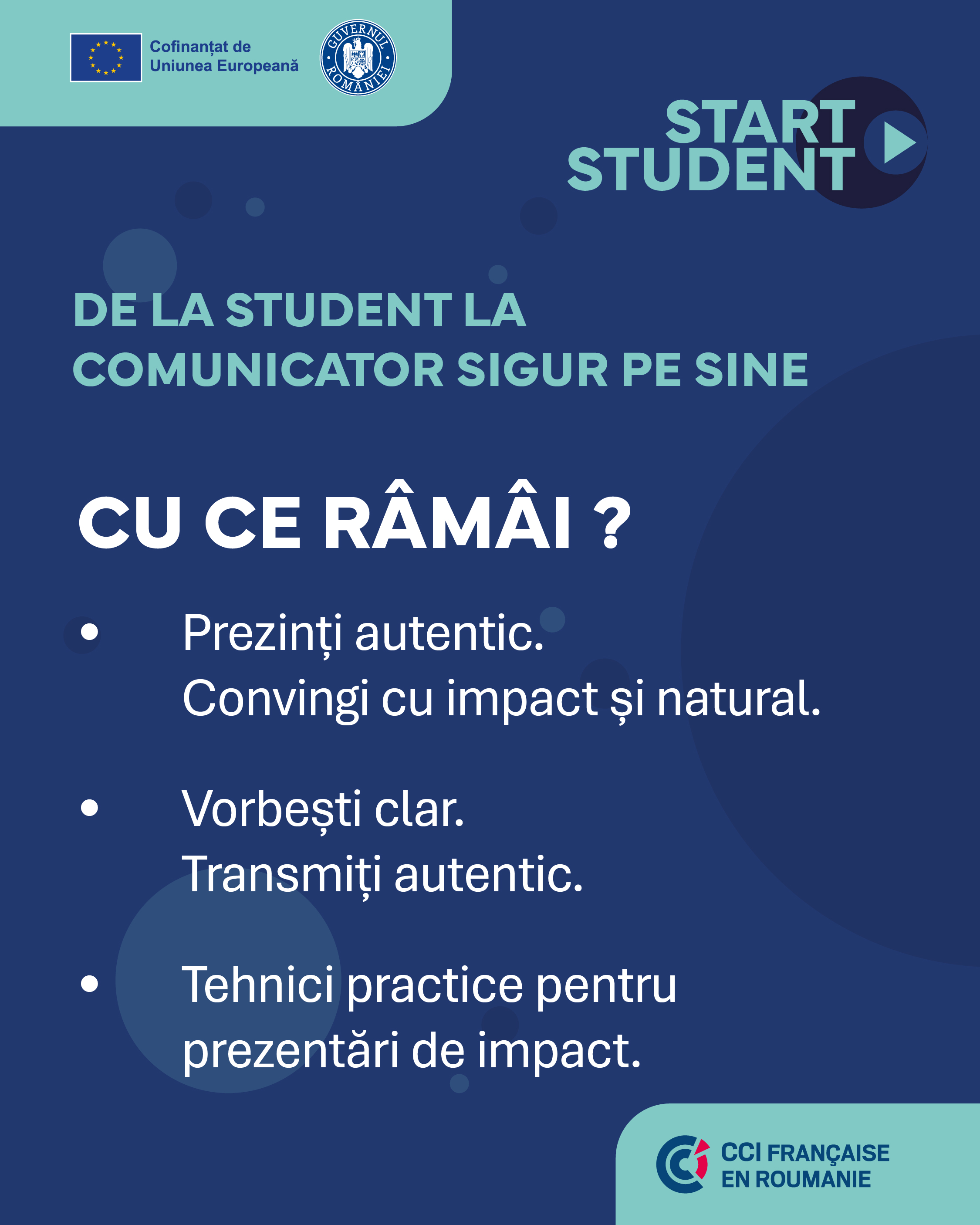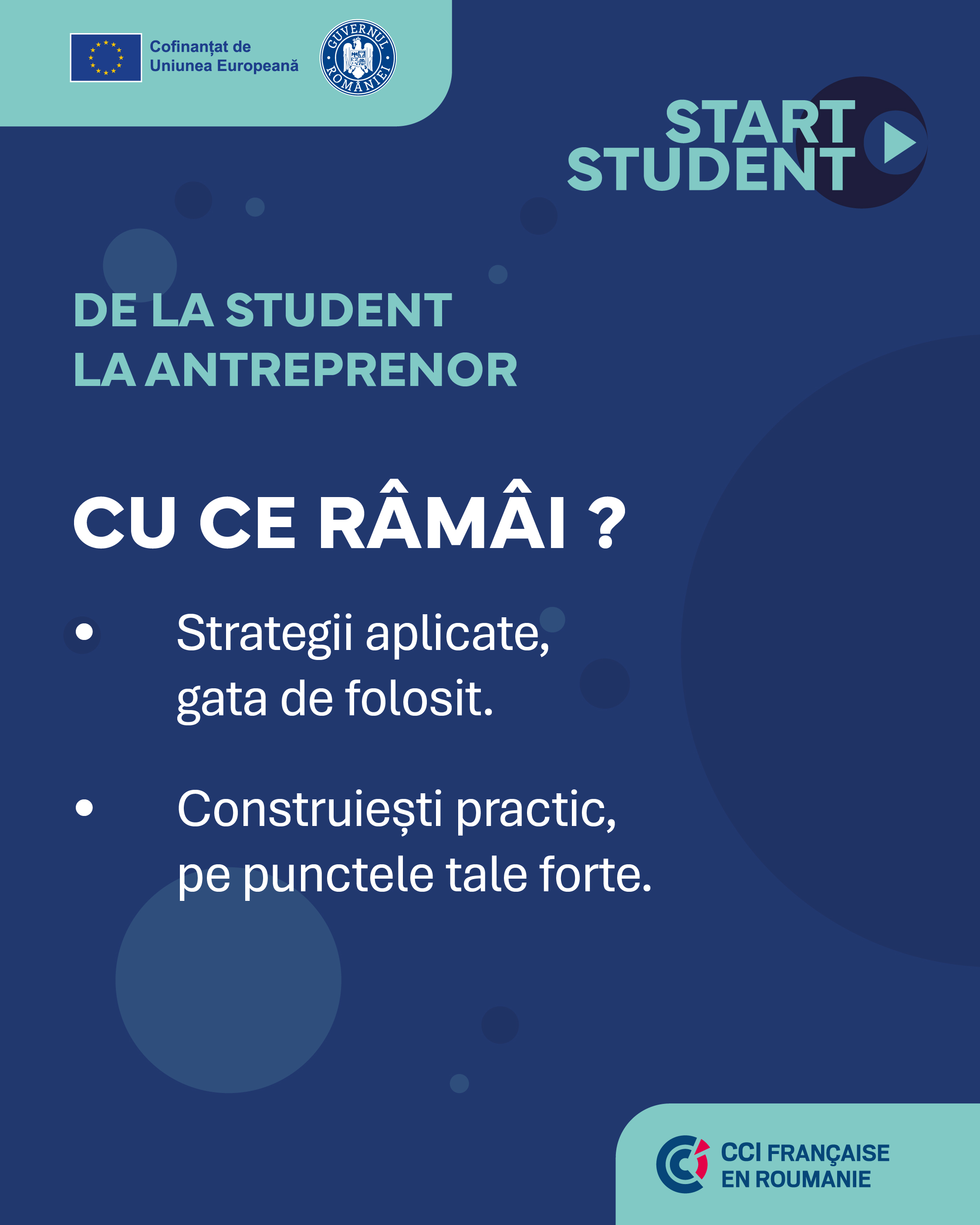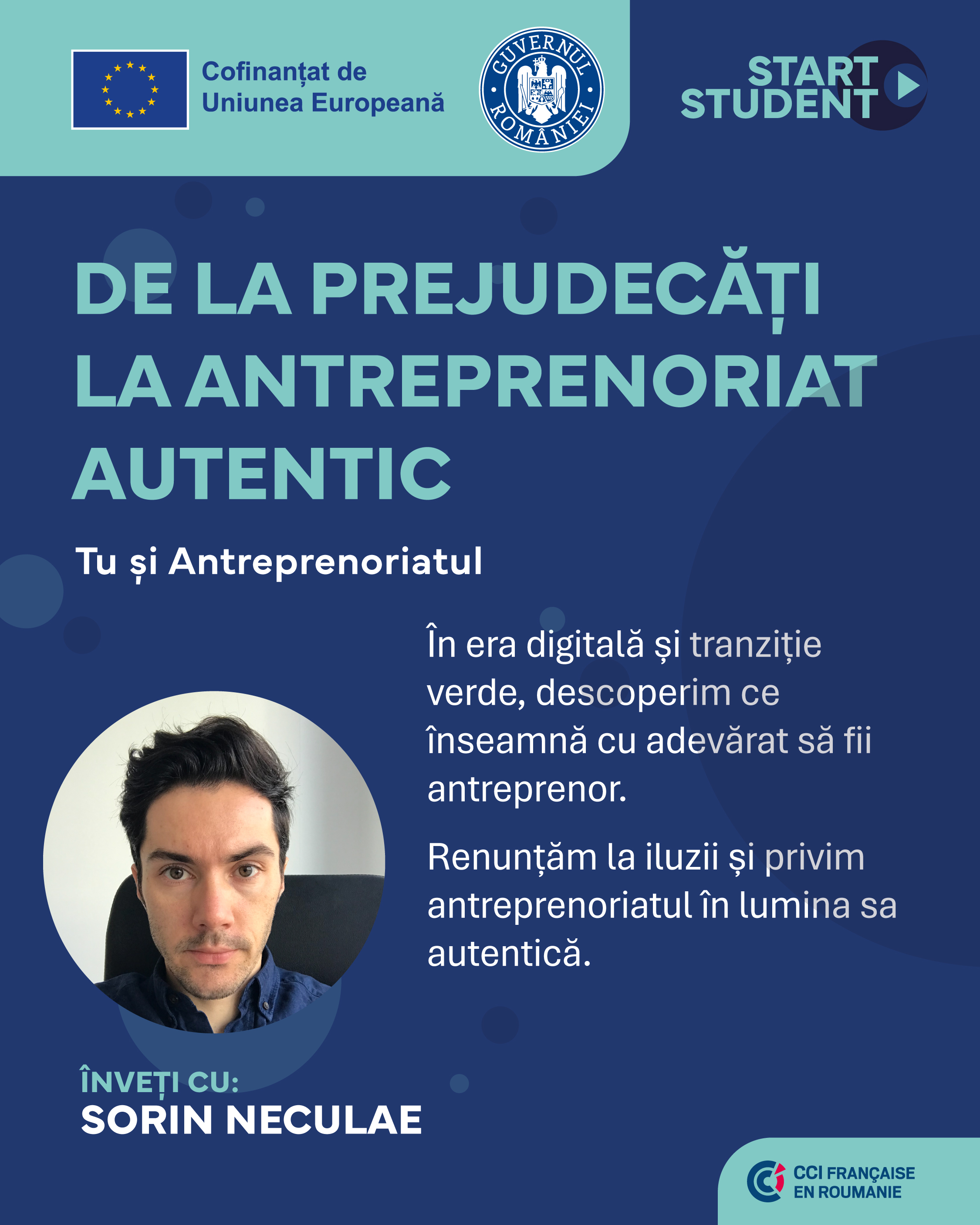 Start Student este programul care îi pregătește pe studenți pentru lumea antreprenoriatului modern. Prin cursuri interactive și mentorat aplicat, participanții explorează teme esențiale – de la strategie și pitching, la marketing bazat pe date și AI, reflecție personală, impact și sens.